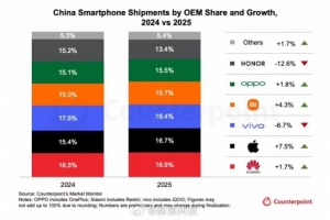 体育资讯1月19日讯 Counterpoint Research 在今日发布的新闻稿中表示,中国智能手机市场 2025 年第四季度出货量同比减少 1.6%,而 2025 年全年的出货则减少了 0.5%。