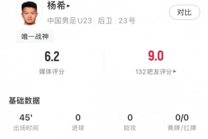 U23国足右边后卫杨希半场表现如下: