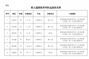 根据中国乒乓球协会关于举办2026年国家青年队入队选拔赛(U15组)的通知及《2026年国家青年队入队选拔赛(U15组)竞赛规程》要求,21名运动员拟入选国家青年队。现对运动员名单进行公示,公示期为2026年1月29日至2026年2月3日(名单附后)。