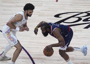 上赛季季后赛首轮快船和掘金抢七的比赛,哈登8投2中,得到7分5板13助攻2失误,正负值-29。