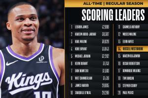 这样威少生涯总得分已经超越奥拉朱旺,(26946分),历史得分榜排名将上升至第14位。