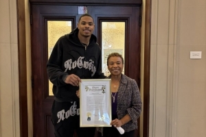 Marc J. Spears写道:“迈阿密热火前锋凯沙·约翰逊在周日赢下NBA扣篮大赛后,今日在奥克兰市政厅获颁来自奥克兰市长Barbara Lee及市议会议员的嘉奖令。”