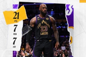 赛后湖人官方发布詹姆斯和东契奇本场数据海报,詹姆斯砍下21分7篮板7助攻,东契奇砍下27分10篮板7助攻。