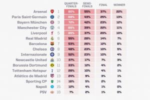 最新的欧冠夺冠概率: