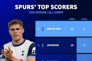 德国转会市场统计了本赛季热刺队内球员的进球数量,并列出榜单,中卫范德芬6球居首。