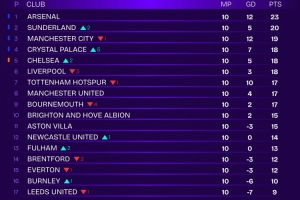 体育资讯11月5日讯 Squawka每周都会让球迷投票选出最具争议的VAR判罚,并列出了去除VAR争议判罚之后的英超积分榜,阿森纳23分居首,桑德兰20分次席。