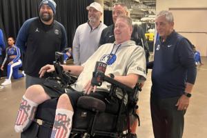 体育资讯11月06日讯 前NBA球员、53 岁的“大竹竿”肖恩·布拉德利今日坐轮椅观战独行侠,并与他的独行侠前队友波派·琼斯聊天。