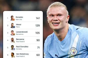 25岁哈兰德52场欧冠轰入54球,目前排在欧冠历史射手榜第10。距离第9的穆勒差3球。