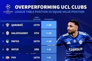 体育资讯11月6日讯 德国转会市场根据球队目前欧冠排名与阵容身价排名的差异,列出本赛季欧冠表现超出预期球队榜单,卡拉巴赫居首。