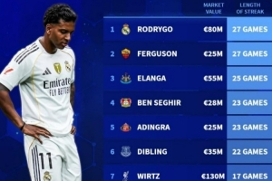 体育资讯11月8日讯 德转盘点了目前遭遇进球荒的攻击手,其中罗德里戈27连续27场进球荒居首,以下为具体情况(只统计身价2500万欧以上球员):