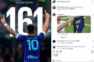 劳塔罗也转发了相关数据,并晒出自己的庆祝照纪念,同时配上“🖤💙💪🙏”表情符号。