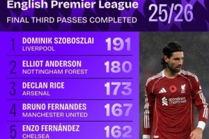 本赛季英超进攻三区成功传球榜: