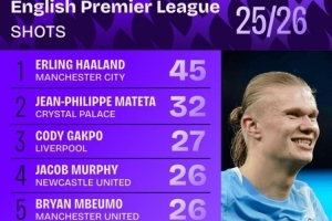 本赛季英超射门榜: