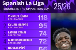 体育资讯11月12日讯 本赛季西甲进行了12轮比赛,Squawka统计了在对方禁区内触球次数榜,维尼修斯118次居首,姆巴佩、亚马尔二三位。
