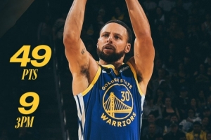 此役,库里出战36分03秒,26投16中,三分17中9,罚球8中8,砍下49分4篮板2助攻2抢断。