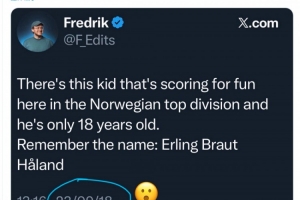 2018年9月23日,记者Fredrik在社交媒体上写道:“挪威顶级联赛有一个少年,进球如同探囊取物,而他只有18岁。请记住这个名字——埃尔林·布赖于特-哈兰德。”