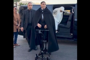 体育资讯11月20日讯 非洲足球联合会颁奖典礼,据土耳其媒体Fotomaç报道,因脚踝受伤,阿什拉夫骑着特制的滑板车出席。