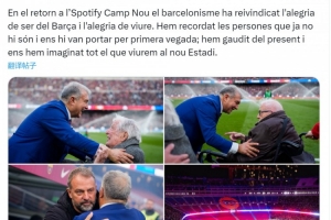 巴萨俱乐部主席拉波尔塔在社交媒体上写道:“在重返坎普诺的这一天,巴萨球迷们重新找回了身为巴萨人的喜悦与快乐。”