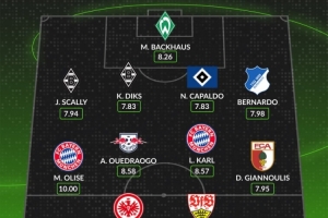 中场:迈克尔·奥利塞(拜仁,10.00分)、阿桑·韦德拉奥果(莱比锡,8.58分)、伦纳特·卡尔(拜仁,8.57分)、迪米特里斯·吉安努利斯(奥格斯堡,7.95分)