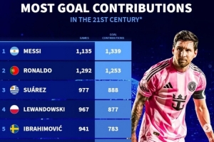体育资讯11月24日讯 《转会市场》统计了新世纪各项赛事直接参与进球情况,梅西力压C罗居首。