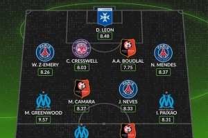 体育资讯11月24日讯 法甲第13轮联赛已经完赛,whoscored也根据评分列出了本轮最佳阵容,巴黎、马赛和雷恩各3将入围。