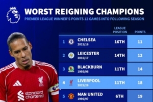 体育资讯11月24日讯 利物浦在本轮英超焦点战主场0-3完败诺丁汉森林,12轮联赛后仅积18分,《转会市场》统计显示他们也是同期战绩第4差的英超卫冕冠军。