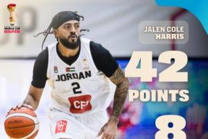 此役,约旦归化球员、前同曦外援杰伦·哈里斯表现神勇,他登场29分56秒24投13中,三分16中8、罚球9中8,狂砍42分6篮板2助攻2抢断,正负值+49。
