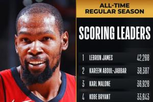 杜兰特31000分用时1141场,追平詹姆斯,并列历史第三快。