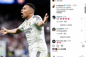 本场比赛姆巴佩破门,赛后他也在个人社媒晒出庆祝进球照片,配文写道:“国家德比胜利属于我们,球队展现出很棒的活力,皇马加油!”