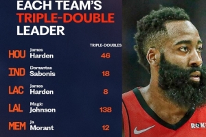 休斯顿火箭队:詹姆斯·哈登46次;