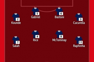 中场:萨拉赫(利物浦)、赖斯(阿森纳)、麦克托米奈(那不勒斯)、拉菲尼亚(巴萨)