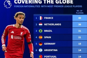 体育资讯10月27日讯 《转会市场》统计了当前英超的各国家/地区的外援数量,法国球员多达40人。
