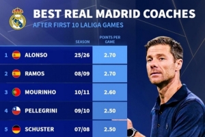 体育资讯10月27日讯 皇马在本轮西甲焦点战2-1力克巴萨,阿隆索带队延续了出色的战绩。德转数据统计显示,阿隆索执教皇马的前10轮西甲拿分并列历史第一。