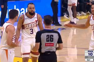 GIF-狄龙被砸 裁判只是给了巴特勒延误比赛的警告 狄龙非常不满