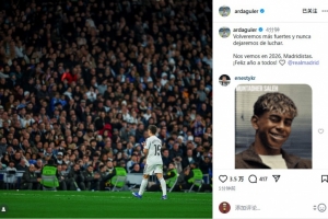居莱尔写道:“我们将以更强姿态回归,并且永不停止奋斗。2026年见,马德里主义者们。祝大家新年快乐!”
