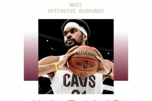 截至发稿,阿伦抢到2个前场篮板,骑士生涯前场篮板数来到1036位,超过詹姆斯(1034)升至队史第10。