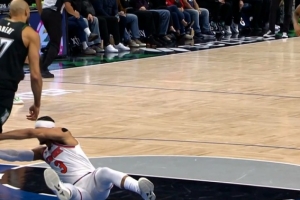GIF-戈贝尔和哈特抢篮板对抗激烈 哈特倒地后扒拉了一下戈贝尔膝盖引发冲突