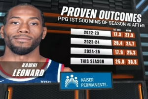 莱昂纳德近四个赛季赛季500分钟之前和之后场均得分对比: