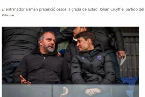 体育资讯1月4日讯 西班牙《每日体育报》报道,当地时间周日,巴萨主帅弗里克趁着一线队休假的空档与巴萨体育副主管博扬一同前往约翰·克鲁伊夫球场,现场观看了西协乙巴萨竞技队(巴萨B队)4-0大胜伊比萨岛的比赛。