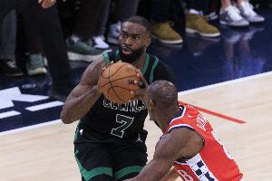 杰伦·布朗出战35分08秒,26中18,其中三分10中6,罚球10中8,得到50分3篮板5助攻,正负值+21!
