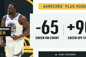 据统计,12月以来追梦在场时勇士正负值为-65,而当他下场时球队正负值为+90。