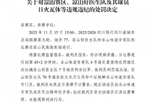 四川省足协今日对外公布了11月15日川超比赛凉山队和对裁判实施暴力行为致使裁判受伤的凉山队球员日火瓦体的纪律处罚决定,决定落款时间为12月30日。其中日火瓦体被禁赛5年,在四川省足协管辖范围内生效,并将抄送中国足协备案。