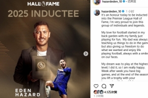 体育资讯10月29日讯 英超官方宣布,切尔西名宿阿扎尔入选英超名人堂。阿扎尔更新社媒,谈到自己得奖的兴奋之情。