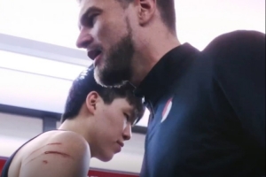 赛后更衣室内,球队临时主帅斯普利特满脸笑容,里斯获得球队本场最佳防守球员,与斯普利特拥抱时,杨瀚森的手臂抓伤清晰可见。