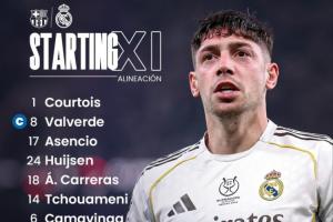 更新后的皇马首发:1-库尔图瓦、8-巴尔韦德、17-阿森西奥、24-赫伊森、18-卡雷拉斯、14-琼阿梅尼、6-卡马文加、11-罗德里戈、5-贝林厄姆、7-维尼修斯、16-贡萨洛·加西亚