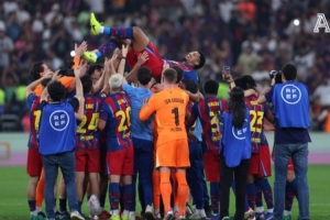 体育资讯1月16日讯 巴萨全队在夺得西超杯冠军赛后围在刚刚回归的阿劳霍身边庆祝,并被欢欣鼓舞的队友们高高抛起,替补出场的他最后也作为队长举起了奖杯。